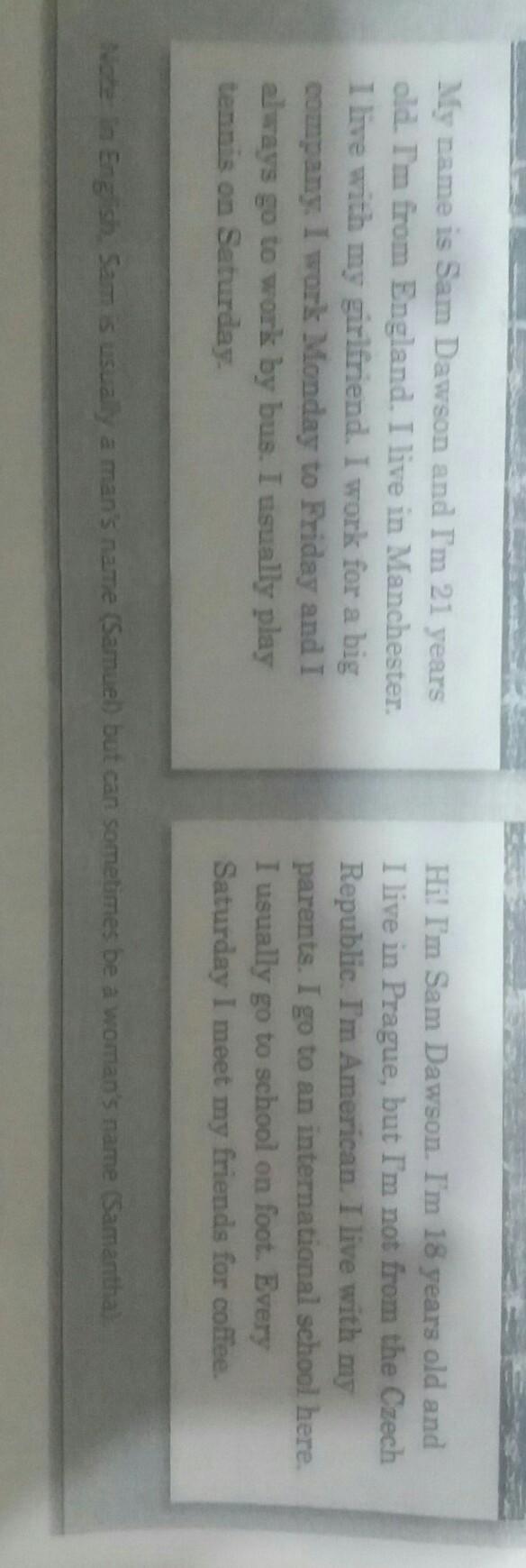 Меня зовут Сэм Доусон и мне 21 год. Я из Англии. Я живу в Манчестере. Я живу со своей девушкой. Я работаю на большую компанию. Я работаю с понедельника по пятницу и я всегда езжу на работу на автобусе. Я обычно играю в теннис по субботам.