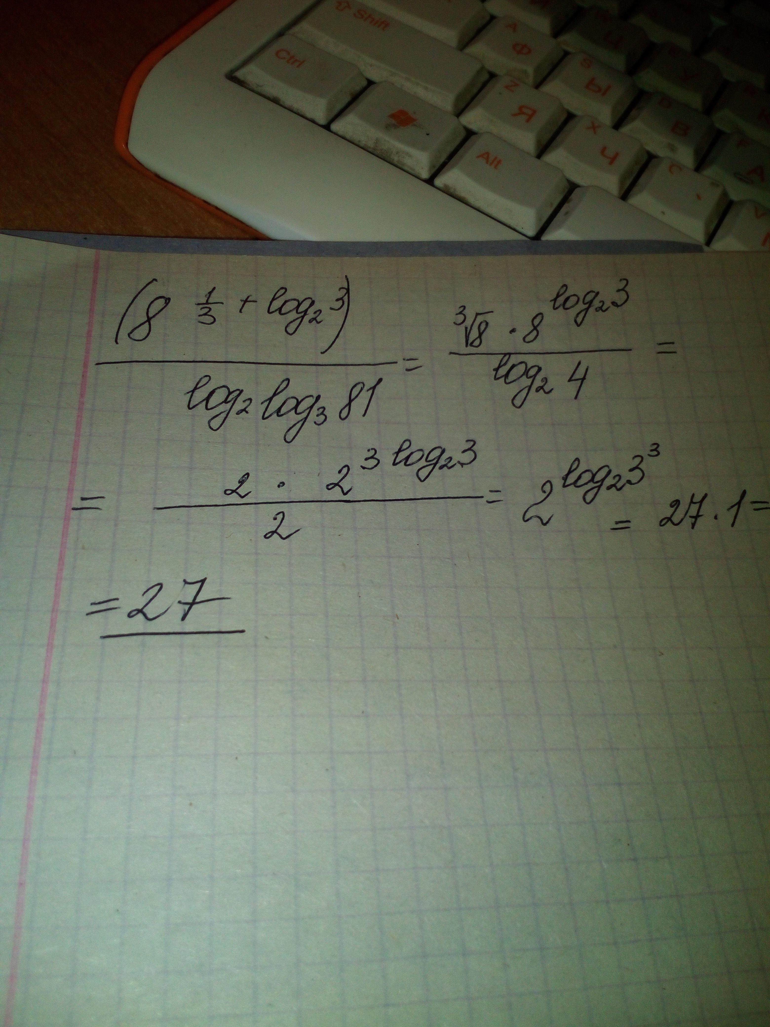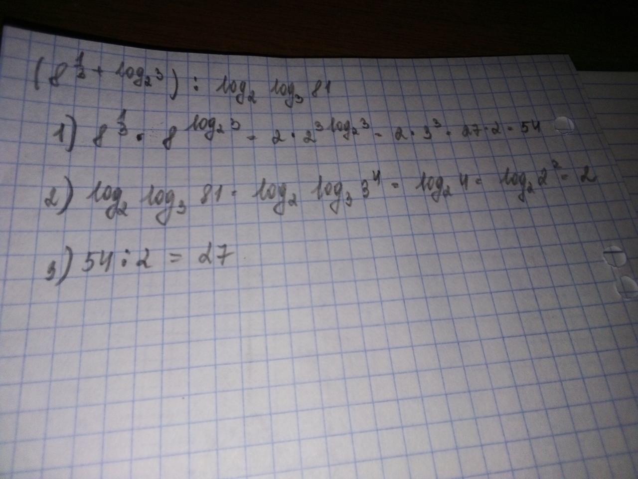 Действие в скобках - основное логарифмическое тождество. И при умножении показателей с одинаковыми основаниями, показатели складываются. 8=2^3 и он переходит в степень к тройке.