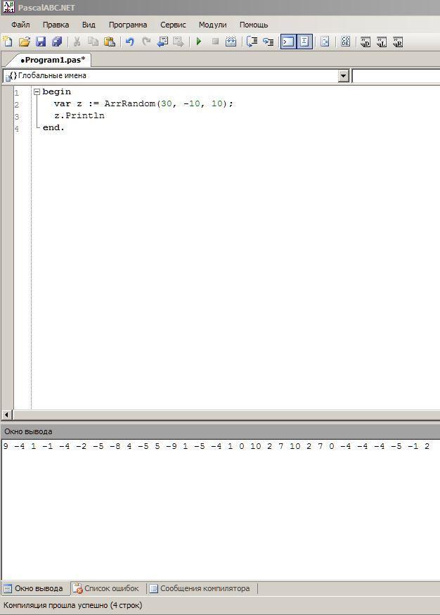 Описать одномерный массив Z из 30 целых чисел. Задать значения элементов случайным образом в диапазоне [-10;10]. Вывести элементы массива в одну строку через пробел