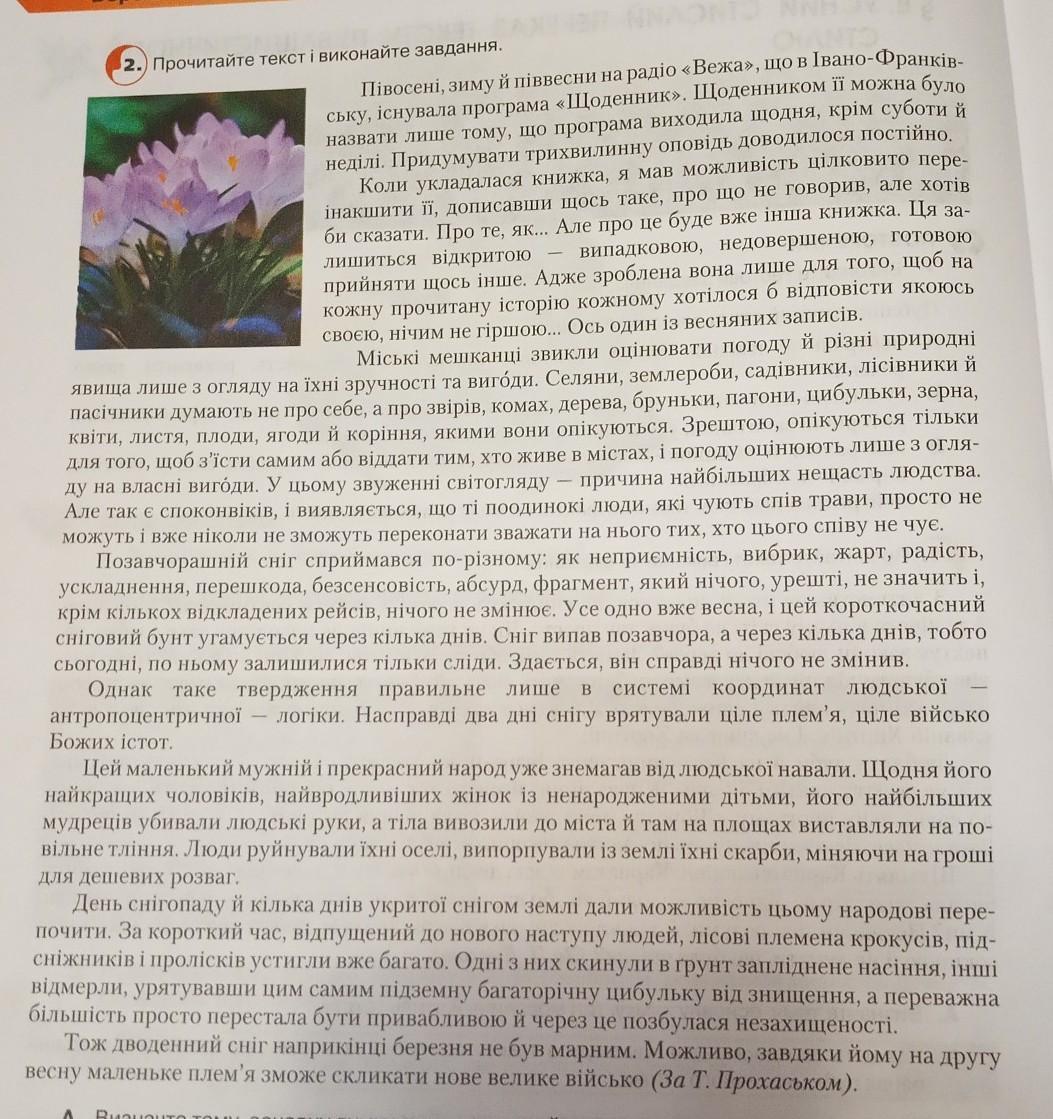 Пивосени, зиму и пиввесны на радио «Башня», что в Ивано-Франковску существувала программа «Дневник». Дневником можно было назвать лишь потому, что программа выходила ежедневно, кроме субботы и воскресенья. Придумывать трехминутный рассказ приходилось ностийно, когда заключалось книга, я имел возможность полностью стирает. инакшиты й, дополнив нечто такое, о чем не говорил, ле хотел бы сказать. О том, как. Но об этом будет уже иниа книга, эта за- випадковоюо, недоверненою, готовой принять то другое. Ведь сделана она только для того, чтобы на каждую прочитанную историю каждом хогилося 6 ответить какой-то останется открытой своей, ничем не хуже .. Вот один из весенних записей. Городские жители привыкли оценивать погоду и различные природные явления только из-за их удобства и выгоды. Крестьяне, земледельцы, садоводы, лесоводы пчеловоды думают не о себе, а о животных, насекомых, деревья, почки, побеги, лука, зерна, цветы, листья, плоды, ягоды и корни, которыми они занимаются. В конце концов, занимаются только для того, чтобы съесть самим или отдать тем, кто живет в городах, и погоду оцинюоть только с огля- ду собственными выгоды. В этом сужении мировоззрения-причина крупнейших нешасть человечества. Но так е испокон веков, и оказывается, что те немногие люди, которые слышат пение травы, просто не могут и вке никогда не смогут убедить считаться с ним тех, кто этого пение не слышит. Позавчерашний снег воспринимался по-разному: как неприятность, выходка, шутка, радость, осложнения, препятствие, безсенсовисть, абсурд, фрагмент, который ничего, наконец, не значат и, кроме нескольких отложенных рейсов, ниче не изменю. Все равно уже весна, и этот кратковременный снежный бунт угомонится через несколько дней. Снег выпал позавчера, а через несколько дней, то есть сегодня, по нему остались только следы. Кажется, он действительно ничего не изменил. Однако такое утверждение верно только в системе координат человеческой антропоцентрической-логики. На самом деле два дня снега спасли целое племя, целое войско Божьих созданий. Этот маленький мужественный и прекрасный народ ужезнемагав от человеческой нашествия. Ежедневно его лучших мужчин, красивых женщин с рожденными детьми, его самых крупных мудрецов убивали человеческие руки, а тела вывозили в город и там плошади выставляли на по- свободное тления. Люди разрушали их дома, випорпувалы из земли их сокровища, меняя на деньги для дешевых развлечений. День снегопада и несколько дней укрытой снегом земле дали возможность этому народу пере- почить. За короткое время, отпущенное к новому наступлению людей, лicoви племена крокусов, под- снежников и подснежников успели уже много. Одни из них сбросили в почву оплодотворенное семя, прочие отмерли, спасши тем самым подземную многолетнюю лук от уничтожения, а подавляющее большинство просто перестала быть привлекательной и поэтому избавилась незащищенности. Поэтому двухдневный снег в конце марта не был напрасным. Возможно, благодаря ему на вторую весну маленькое племя сможет созвать новое большое войско (по Т. Прохасько).