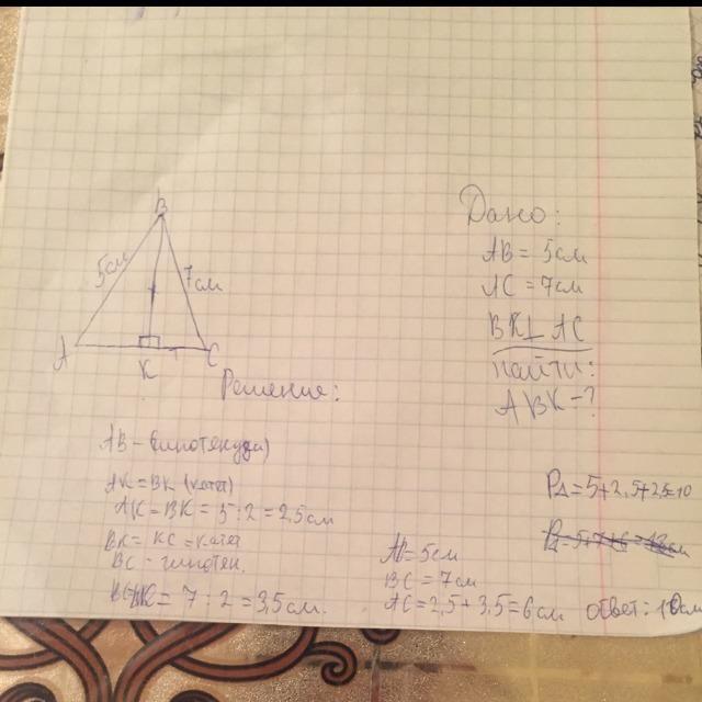 Серединный перпендикуляр к стороне АС треугольника АВС пересекает сторону ВС в точке К . Найти периметр треугольника АВК, если АВ= 5см, ВС=7 см.