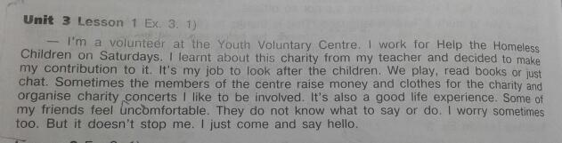 Я волонтер в Центре Молодежи-добровольцев. Я работаю по субботам по программе Помоги бездомным детям. Я узнал об этой благотворительной деятельности от своего учителя и решил внести свой вклад в нее. Иногда члены центра собирают деньги и одежду на благотворительность и организуют благотворительные концерты, в которых я люблю участвовать. Также это хороший жизненный опыт. Некоторые из моих друзей чувствуют себя некомфортно. Они не знают что сказать или сделать. Я тоже иногда волнуюсь. Но это не останавливает меня. Я просто прихожу и здороваюсь.