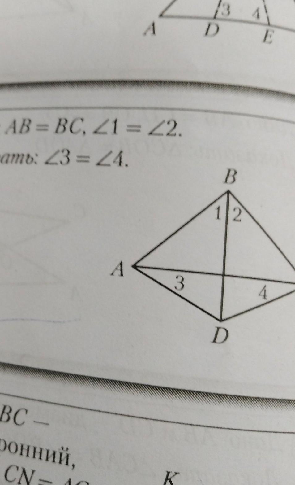 Объяснение: аб=бц, угл 1=углу2,(представим центральное пересечение точкой о) бо общая => треугольники або и боц равны=> ао = оц, углы 1 и 4 равны од общая => угл 3 = углу 4