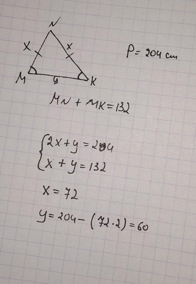 В треугольнике МNK угол M=K, периметр треугольника MNK равен 204 см,сумма длин сторон MN и MK равно 132 см Найдите длину стороны KM