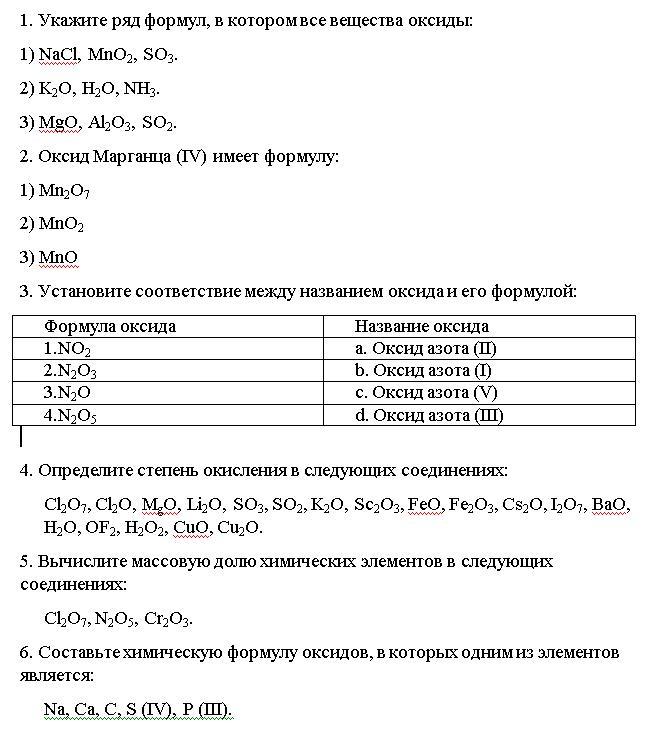 6. Составьте химическую формулу оксидов, в которых одним из элементов является: