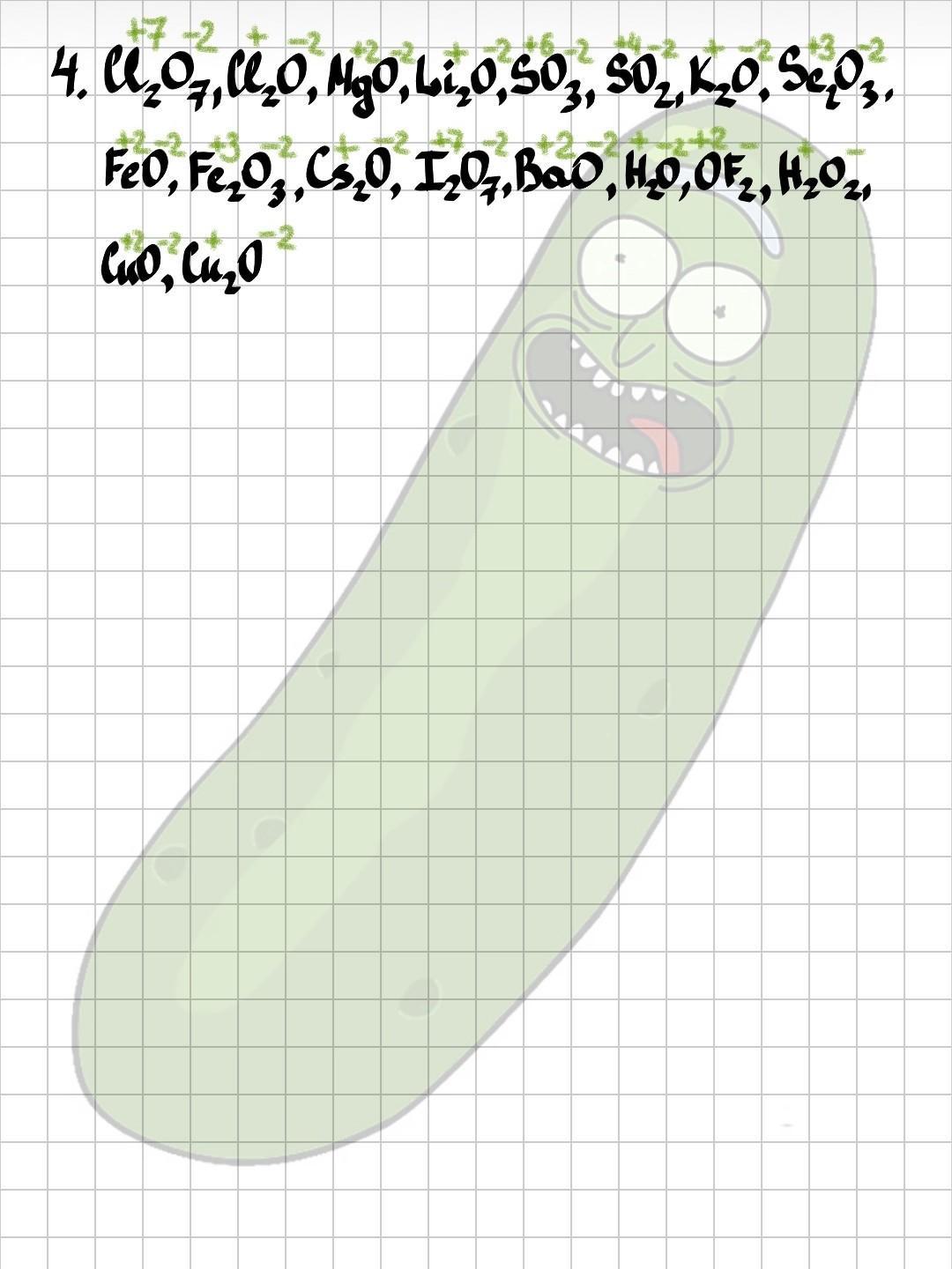 Cl2O7, Cl2O, MgO, Li2O, SO3, SO2, K2O, Sc2O3, FeO, Fe2O3, Cs2O, I2O7, BaO, H2O, OF2, H2O2, CuO, Сu2O.