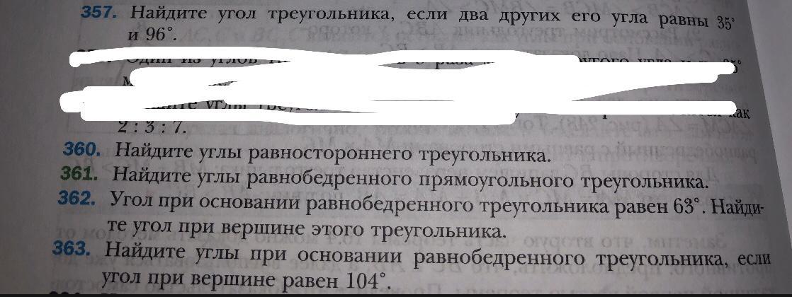 357. Сумма всех углов треугольника 180 градусов. Два известны, 180-(35+96)=180-131=49 градусов