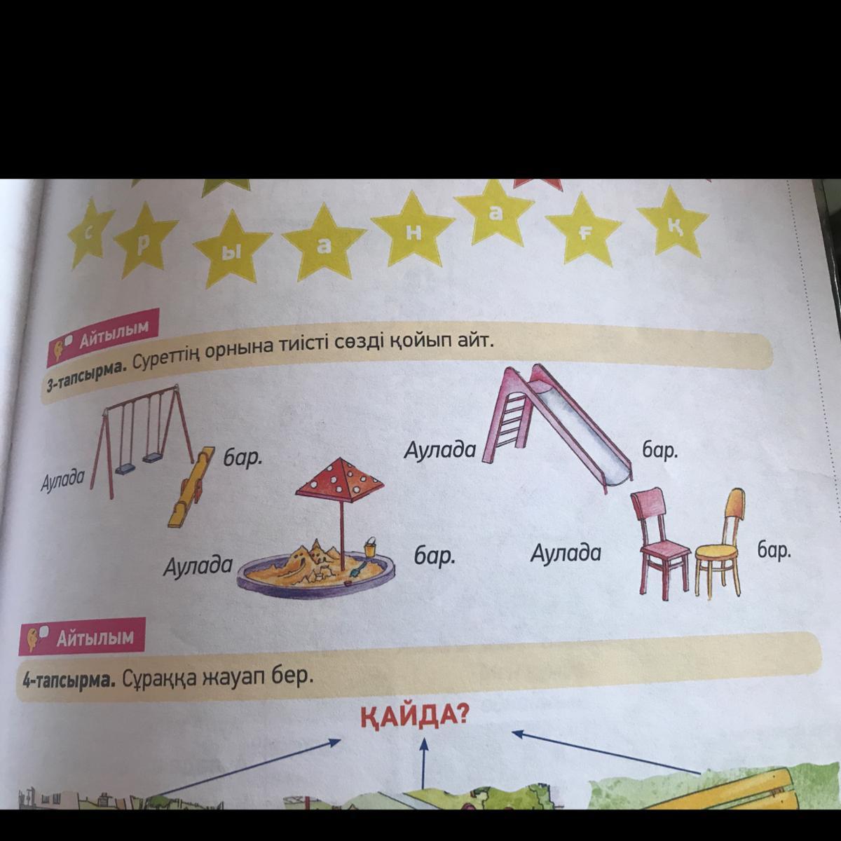 Ответ: Ауылда алтыбақан бар. Ауылда балалар ойнайтын құм бар. Ауылда сырғанақ бар. Ауылда орындықтар бар.