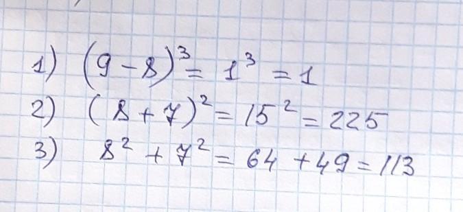 3) 8^2 + 7^2 = 64 + 49 = 113