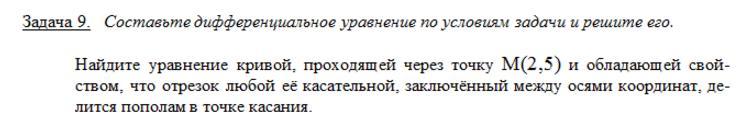 Найдите уравнение кривой, проходящей через точку M(2,5) и обладающей свойством, что отрезок любой ее касательной, заключенный между осями координат, делится пополам в точке касания.