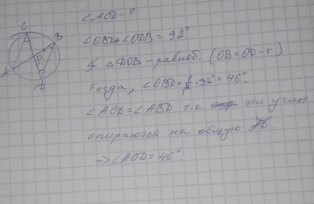 AB и CD - диаметры одной окружности с центром в точке O. Сумма углов OBD и ODB равна 92°. Найдите угол ACD.