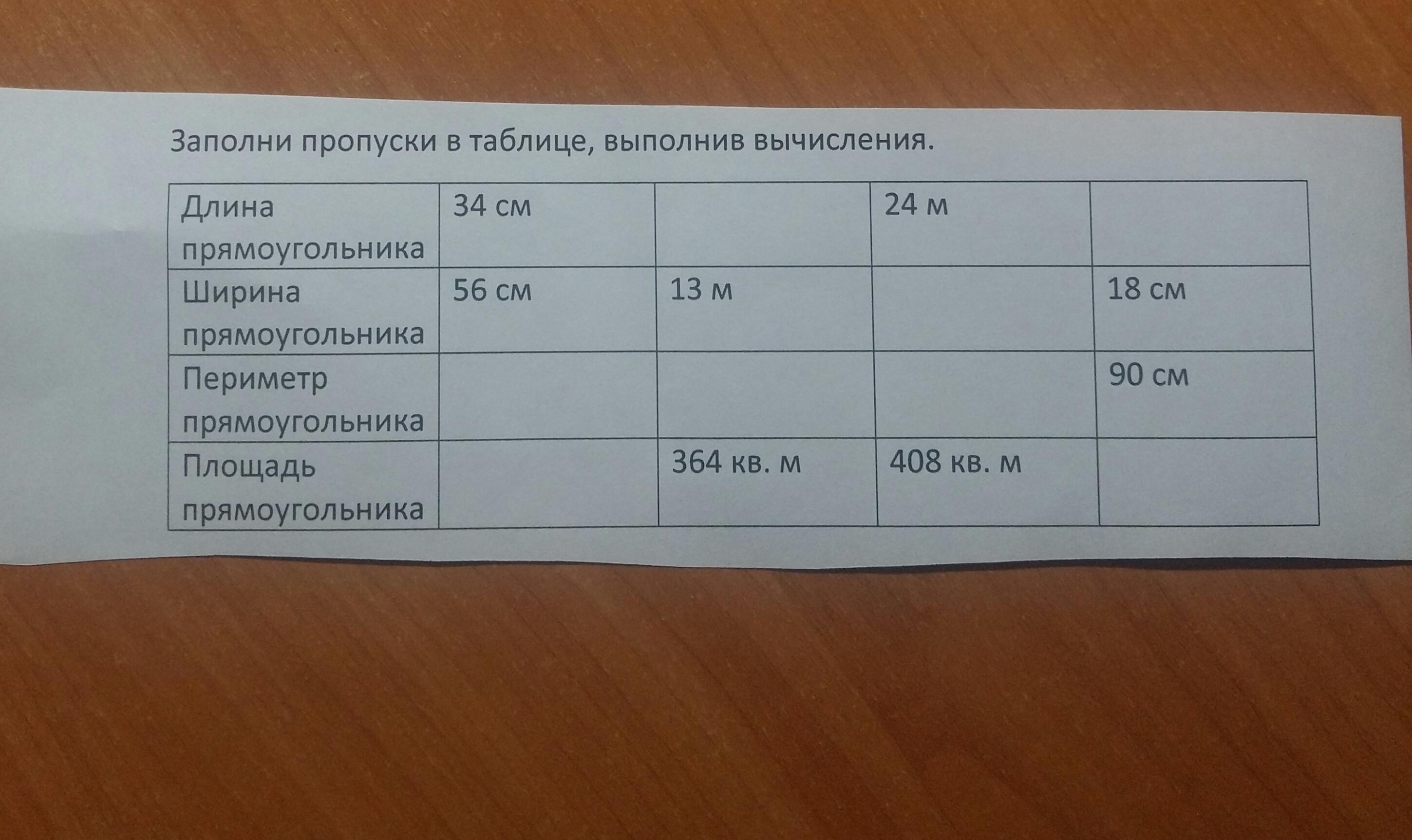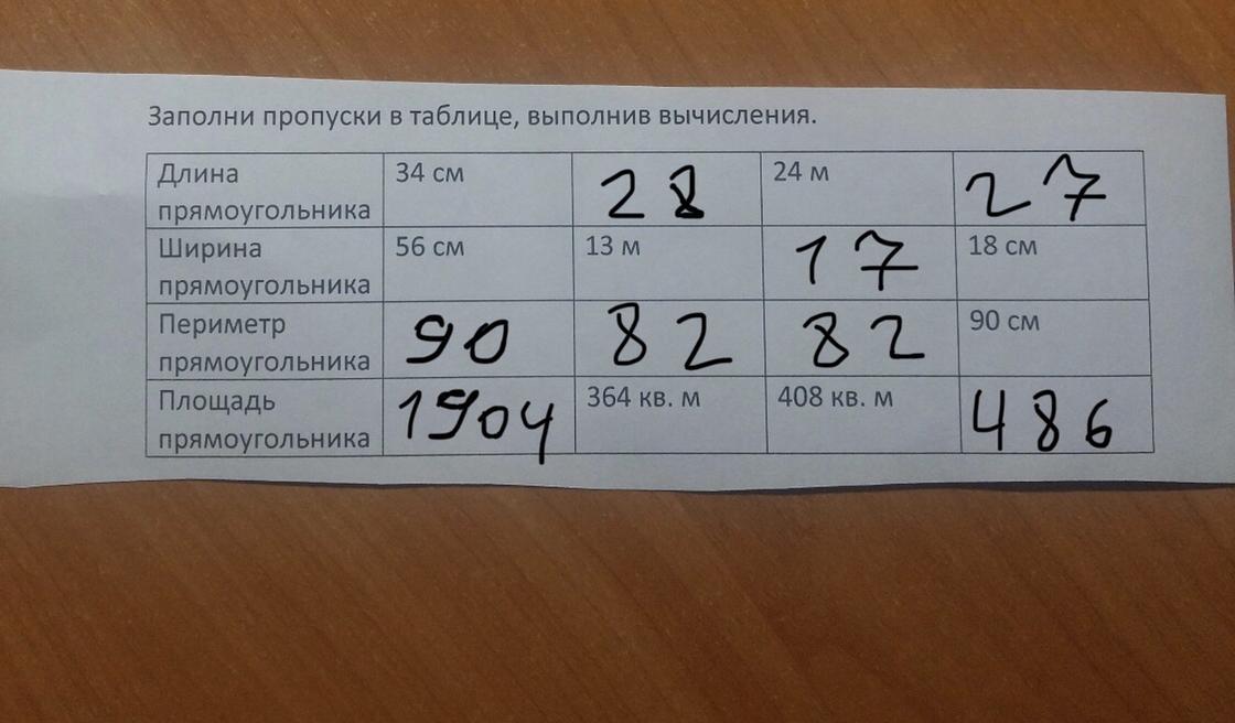 *площадь в см^2 или м^2; длина, ширина и периметр в см или м, прост не влезло*