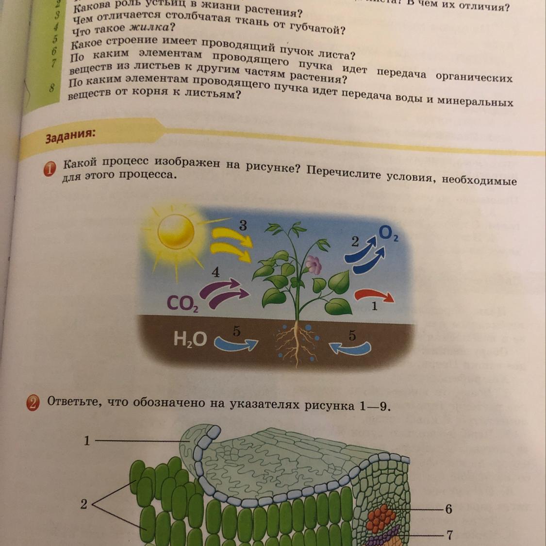 На рисунке изображен процесс фотосинтеза. Условия, необходимые для его протекания: солнечный цвет, пигмент хлорофилл в зеленых частях растения (листья, стебель и т.д. Осенью листья желтеют, и в них не происходит фотосинтез), вода, углекислый газ