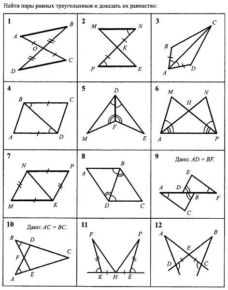 5)углы MFD=EFD по условию, углы MDF=EDF по условию, а сторона DF-общая значиь треугольник MDF=EDF по 2ому признаку