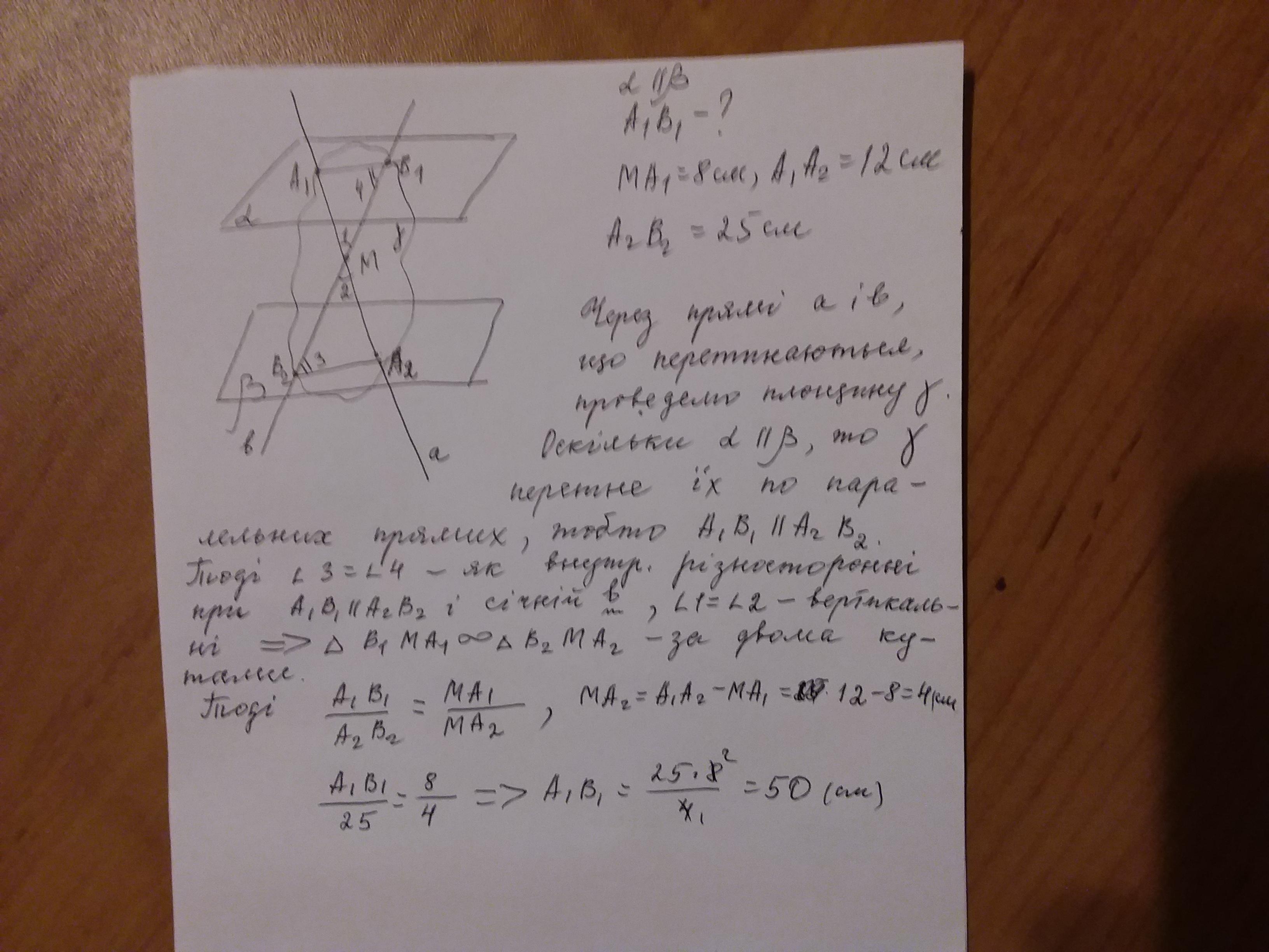 ОЧЕНЬ нужно!Площини альфа і бета паралельні. Через точку М, яка лежить між цими площинами , проведено прямі а і б, що перетинають площиу альфа у точках А1 і В1, а площину бета- у тчоках А2 В2. Знайти довжину відрізка А1В1, якщо МА1=8см, А1А2=12см. А2В2=25 см