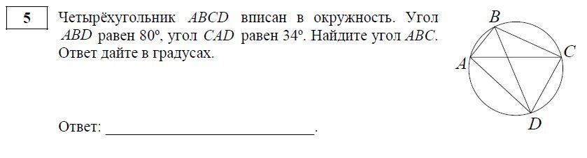 Объяснение:Рассмотрим четырех угольник АВСD: 1) угол DBC опирается на дугу с углом ACD, значит угол DBC= 34 градуса (по свойству вписанного угла) 2) угол ABC= 80+34= 114 градусов Ответ: угол ABC= 114 градусов