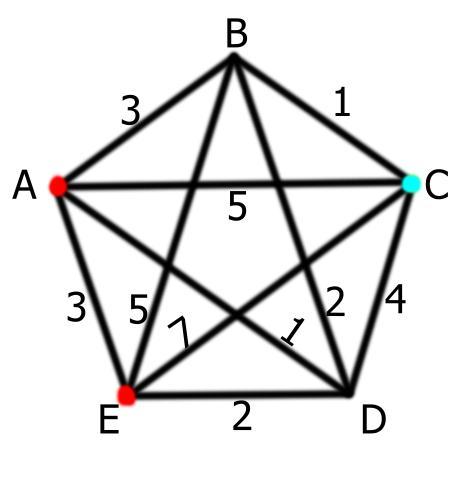 Самый кратчайший путь от C к E равно 5(CBDE) другие больше: CE(7), CDE(6), CAE(8), CBE(6)