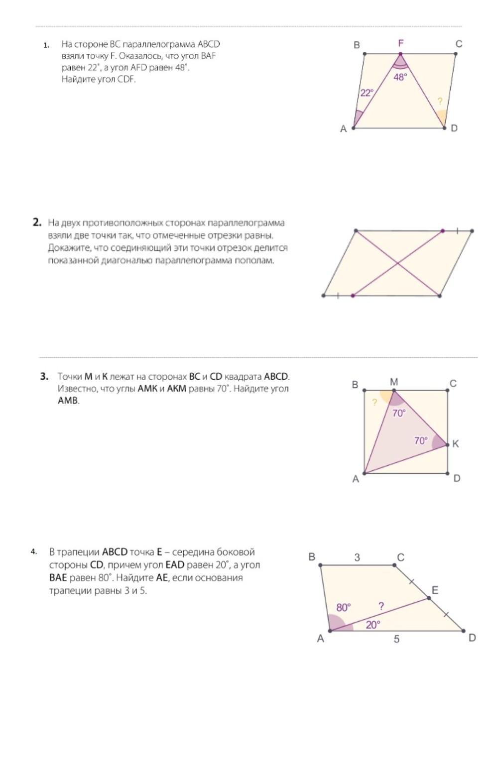 4. Представим, что точка A и C соединены отрезком. Тогда есть два равнобедренных треугольника с равными мерами углов. Угол A равен 100 градусов, BAC = CAD = 100 : 2 = 50 градусов. B = 180 - (50 + 50) = 80 градусов. C = B. Если провести медиану треугольника ACD, она будет равна стороне BC, ведь её можно достроить до квадрата, а у квадрата все стороны равны. Соответственно, по теореме Пифагора находим сторону треугольника ACD: 2,5*2,5 + 3*3 = 5,5 см. При проведении отрезка AE из треугольника ACD образовалось два треугольника, один из которых равнобедренный (CAE). Так как в равнобедренном треугольнике боковые стороны равны, то AC = AE = 5,5