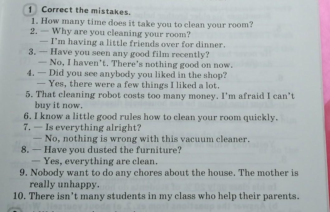 Ответ:1)How much time does it take you to clean your room2)I am having little friends over for dinner3)Have you seen a good film4)Did you see something you liked in the shop5)That cleaning robot costs too much money6)I know some little good rules7)No,everything is wrong8)Yes everything is clean9)Nobody wants 10)There aren't any