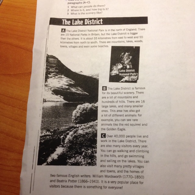 Более 40,000 людей живут и работают в Озёрном крае. Здесь много посетителей каждый год. Вы можете гулять или взбираться на холмы, плавать или пересекать под парусом озёра. Вы также можете посетить привлекательные деревни и города и дома двух знаменитых английских писателей: Уильяма Вордсворта (1770-1850) и Беатрис Поттер (1866-1943). Это очень популярные места для посетителей, так как для каждого здесь что-то есть.