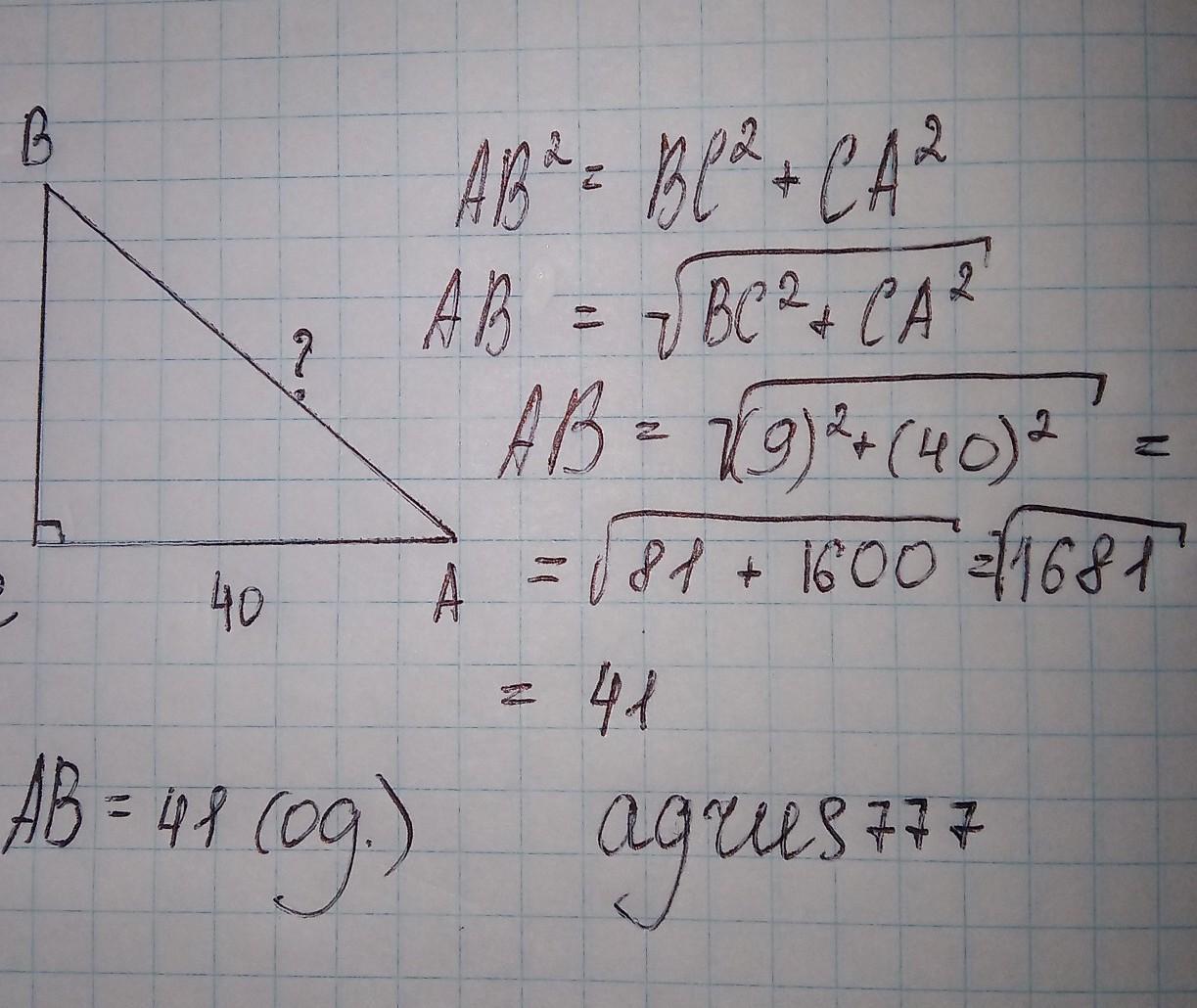 √(9*9+40*40)=√(81+1600)=√(1681)=41