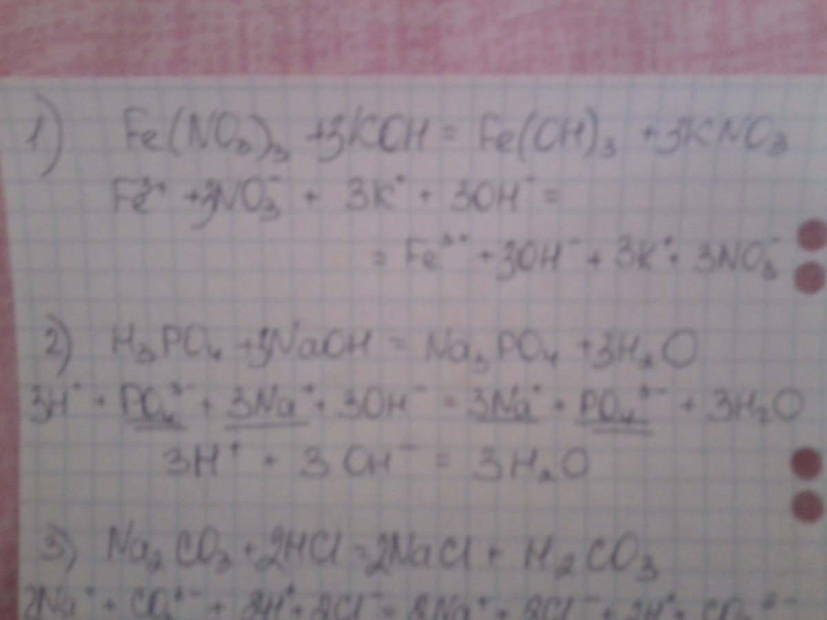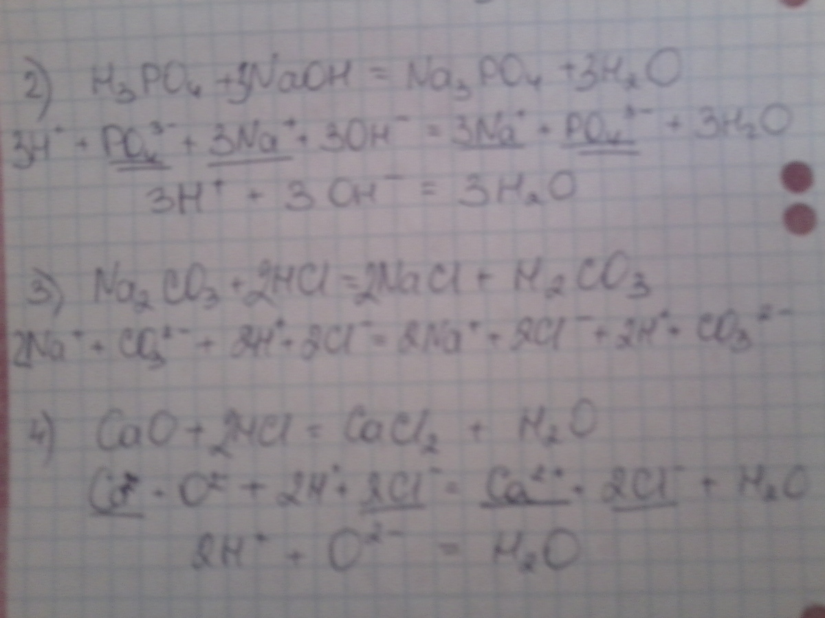 закончите уравнения реакций, составьте полные и сокращенные ионные уравнения: Fe(NO3)3 +KOH= ? ; H3PO4+NaOH= ? ; Na2CO3+HCl= ? ; CaO+HCL= ? Помогите, пожалуйста, срочно