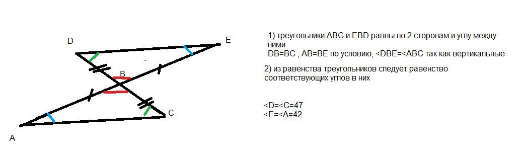 б) Найти углы A и C треугольника ABC, если в треугольнике BDE угол D=47° E=42°