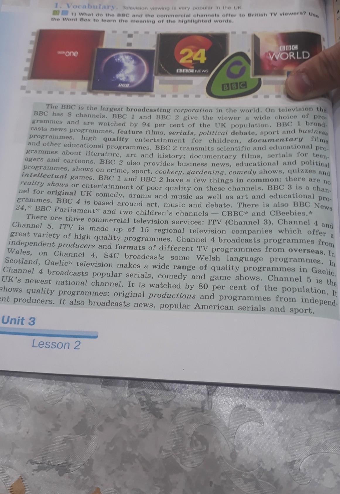 BBC - это самая большая телевещательная корпорация в мире. На телевидении у BBC есть 8 каналов, BBC1 и BBC2 дают зрителям большой выбор программ, и их смотрят 94% процента населения ВБ. BBC1 показывает новостные программы, и в том числе фильмы, сериалы, политические дебаты, спортивные программы и бизнес программы, высококачественные развлекательные программы для детей, документальные фильмы и некоторые другие обучающие программы. BBC2 транслирует научные и обучающие программы про литературу, искусство и историю, сериалы для подростков и мультфильмы. BBC2 также обеспечивает новостями бизнеса, обучающими и политическими программами, криминальными, спортивными, кулинарными шоу, шоу по ухаживанию за садом, комедийными шоу, квизами и интеллектуальными играми. BBC1 и BBC2 имеют несколько схожестей: на обоих каналах нет реалити шоу или развлекательных программ низкого качества. BBC3 - это канал для оригинальной британской комедии, драм и музыки, так же как и для программ про искусство и обучающих программ. BBC4 основан на исскустве, музыке и дебатах. Также есть каналы BBC News 24, BBC Parliament, и два канала для детей: CBBC и CBeebies.