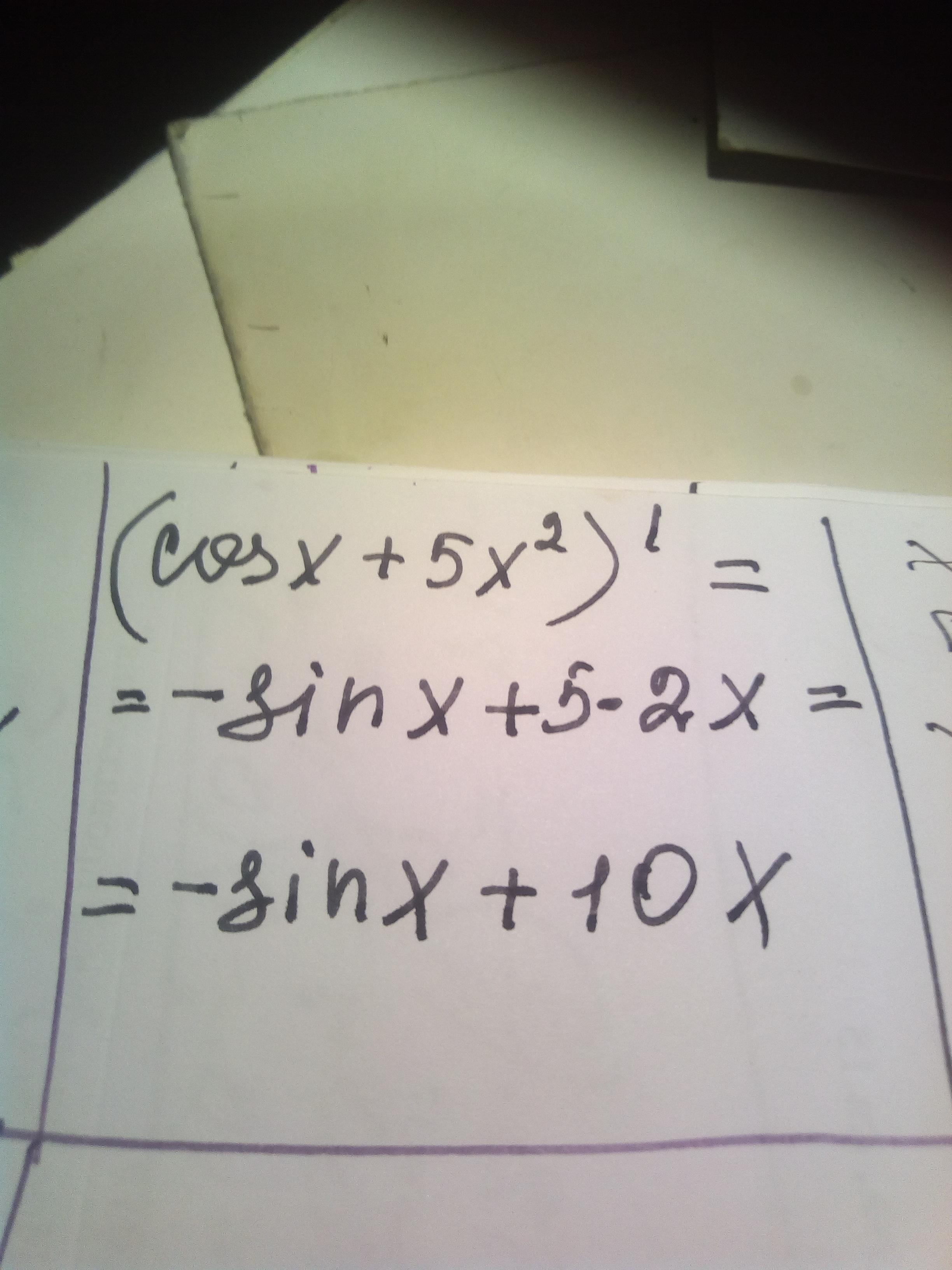(cosx + 5x^2)' = (cosx)' + (5x^2)' = -sinx +5*2x = 10x - sinx