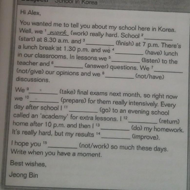 School starts at 8.30 a.m. and finished at 7 p.m. There's a lunch break at 1.30 p.m. and we have lunch in our classroom.In lessons we listen and answer questions