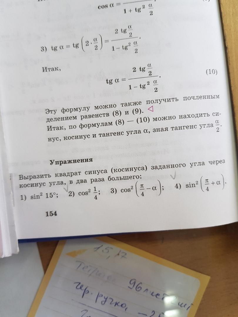 Выразить квадрат Синуса (Косинуса) заданного угла через косинус угла, в два раза большего: sin² (П/4+a) cos²
