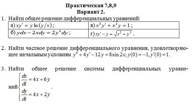 1 б) разделим уравнение на y*dy, тогда оно примет вид dx/dy-2*x/y=2*y³, или dx/dy-2*x/y-2*y³=0. Будем искать решение в виде x=x(y), то есть не y как функцию x, а x как функцию y. Данное уравнение имеет вид x'-2*x/y-2*y³=0 и является линейным уравнением относительно x(y), поэтому решаем его подстановкой x=u*v, где u и v - неизвестные пока функции от y. Тогда x'=u'*v+u*v' и уравнение приобретает вид: u'*v+u*v'-2*u*v/y-2*y³=v*(u'-2*u/y)+u*v'-2*y³=0. Так как одной из функций u или v можно распорядиться произвольно, то поступим так с u и положим u'-2*u/y=0. Это уравнение имеет решение u=y². Подставляя это выражение в уравнение u*v'-2*y³=0, получаем уравнение y²*v'=2*y³, или v'=2*y. Это уравнение имеет решение v=y²+C, и тогда x=u*v=y⁴+C*y². Перенося x в правую часть, находим общий интеграл уравнения: y⁴+C*y²-x=0.