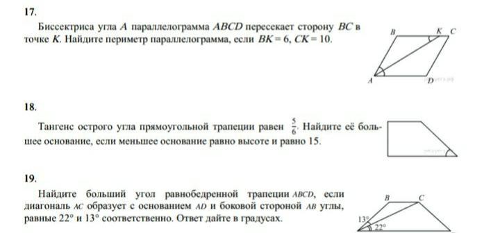 18. 1) Опускаем высоту в трапеции, которая равна 15(по усл.), получаем квадрат со стороной 15 и прямоугольный треугольник с катетом 15. 2) Т.к , то второй катет равен: