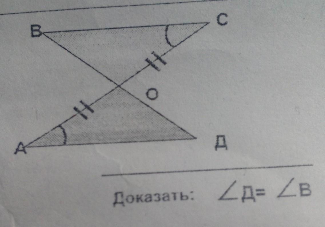 Д равен В . треугольник ВОС равен АОД , т.к угол А равен углу С Угол АОД РАВЕН ВОС , АО РАВЕН СО . Тогда если треугольники равны , то угол Д равен углу В