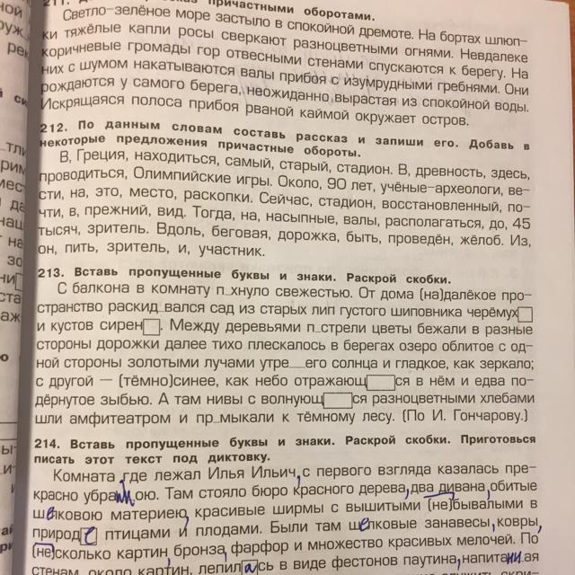 С балкона в комнату пахнуло (пАхнет) свежестью. От дома на (очень) далёкое пространство раскидывался (суффикс -ыва) сад из старых лип, густого шиповника, черемухи (родит. падеж) и кустов сирени (р.падеж). Между деревьями пестрели (пЁстрый) цветы, бежали в разные стороны дорожки, далее тихо плескалось в берегах озеро, облитое с одной стороны золотыми лучами утреннего (суфф. -енн) солнца и гладкое, как зеркало; с другой - темно-синее (2 цвета), как небо, отражающееся (3-е лицо, ед. число, несовершенный вид) в нем и едва подернутое зыбью. А там нивы с волнующимися (множ. число, несов. вид) разноцветными хлебами шли амфитеатром и примыкали к темному лесу.