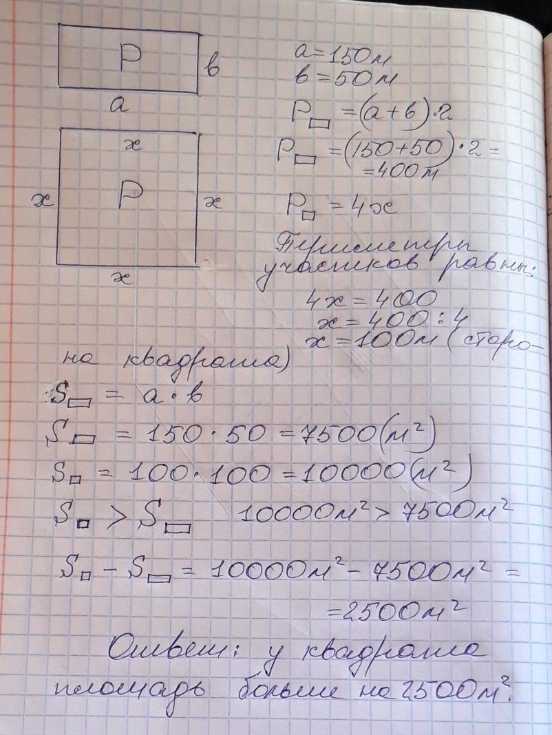 Два участка земли огорожены заборами одинаковой длины. Первый участок имеет форму прямоугольника со сторонами 150 м и 50 м, а второй участок имеет форму квадрата.