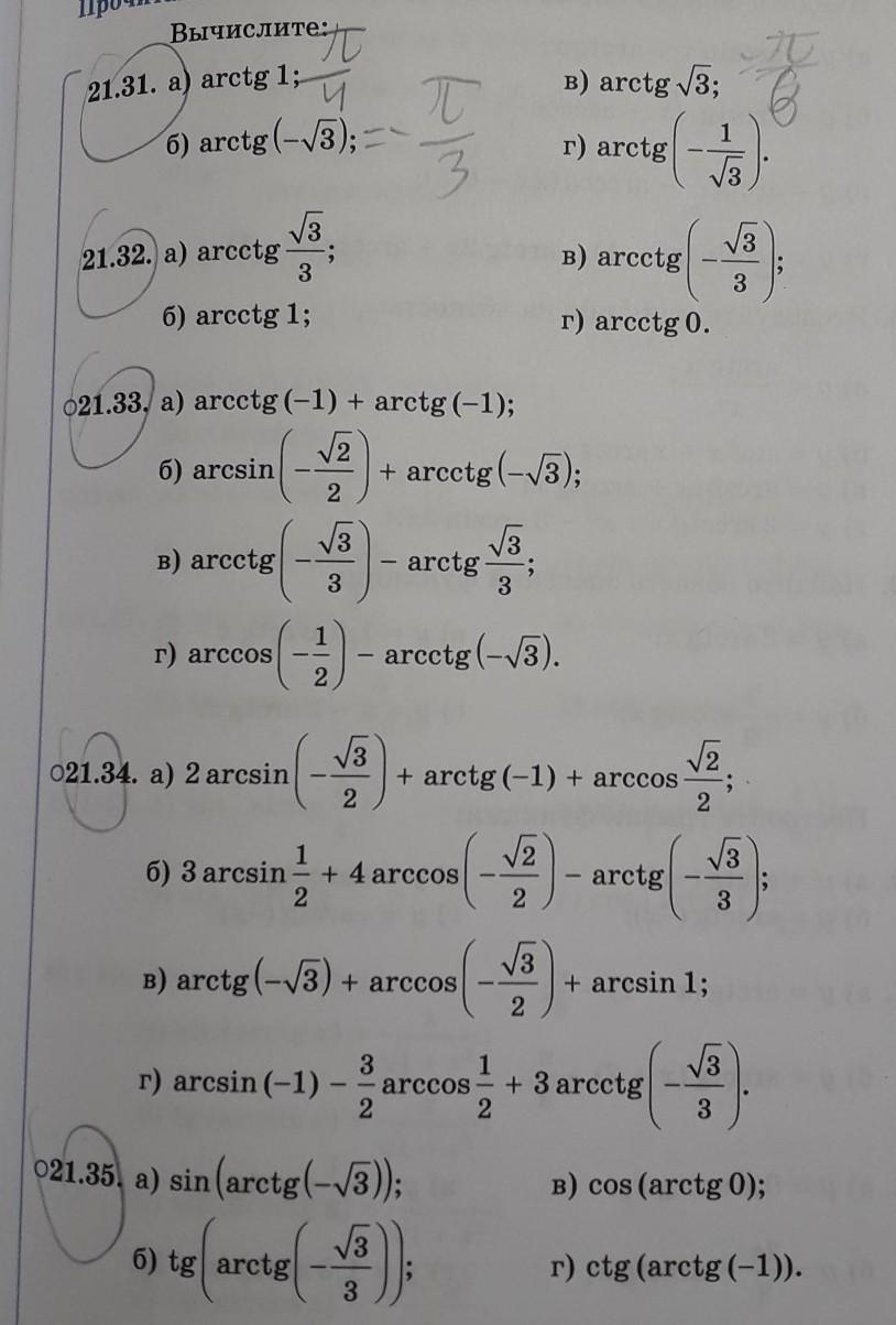 21.34)arctg(-\sqrt{3} )+arcCos(-\frac{\sqrt{3}}{2})+arcSin1=-\frac{\pi }{3}+\frac{5\pi }{6}+\frac{\pi }{2}=\frac{-2\pi+5\pi+\pi}{6}=\frac{4\pi}{6}=\frac{2\pi}{3}\\\\arcSin(-1)-\frac{3}{2}arcCos\frac{1}{2}+3arcCtg(-\frac{\sqrt{3}}{3})=-\frac{\pi }{2}-\frac{3}{2}*\frac{\pi }{3}+3*\frac{2\pi }{3}=-\frac{\pi }{2}-\frac{\pi }{2}+2\pi=-\pi+2\pi=\pi