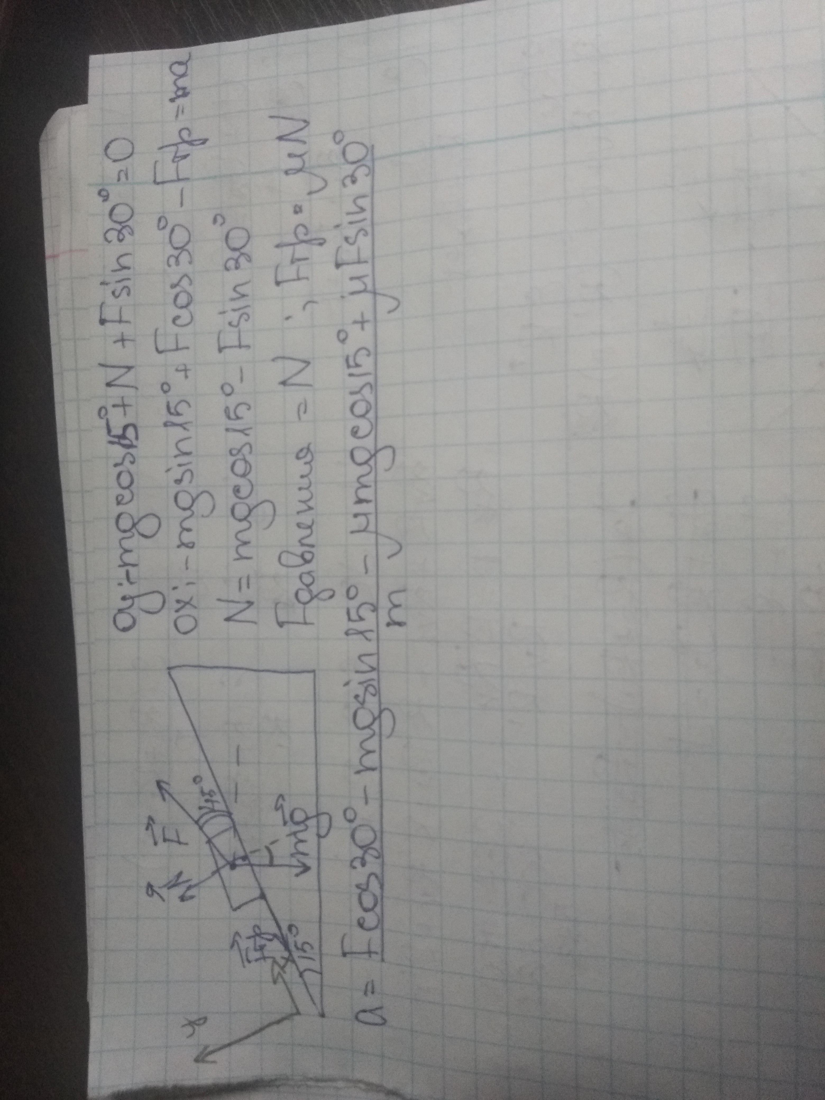 Мальчик тянет сани массой 50 кг в гору с силой 200 Н. Угол наклона горы 15 градусов.Веревка за которую он тянет составляет угол в 45 градусов с горизонтом. Коэффициент трения санок о поверхность горки 0,2. Определить ускорение, с которым движутся санки и силу давления санок на горку