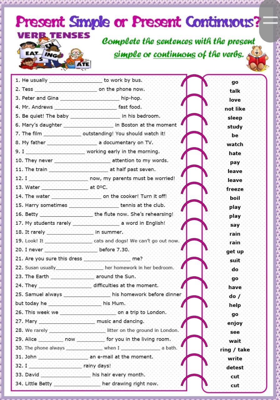 1) goes; 2) is talking; 3) love; 4) doesn't like; 5) is sleeping; 6) is studying; 7) is; 8) is watching; 9) hate; 10) pay; 11) leaves; 12) am leaving; 13) freezes; 14) is boiling; 15) plays; 16) is playing; 17) say; 18) rains; 19) is raining; 20) get up; 21) suits; 22) does; 23) goes; 24) are having; 25) does; is helping; 26) are going; 27) enjoys; 28) see; 29) is waiting; 30) rings; take; 31) is writing; 32) detest; 33) cuts; 34) is cutting.