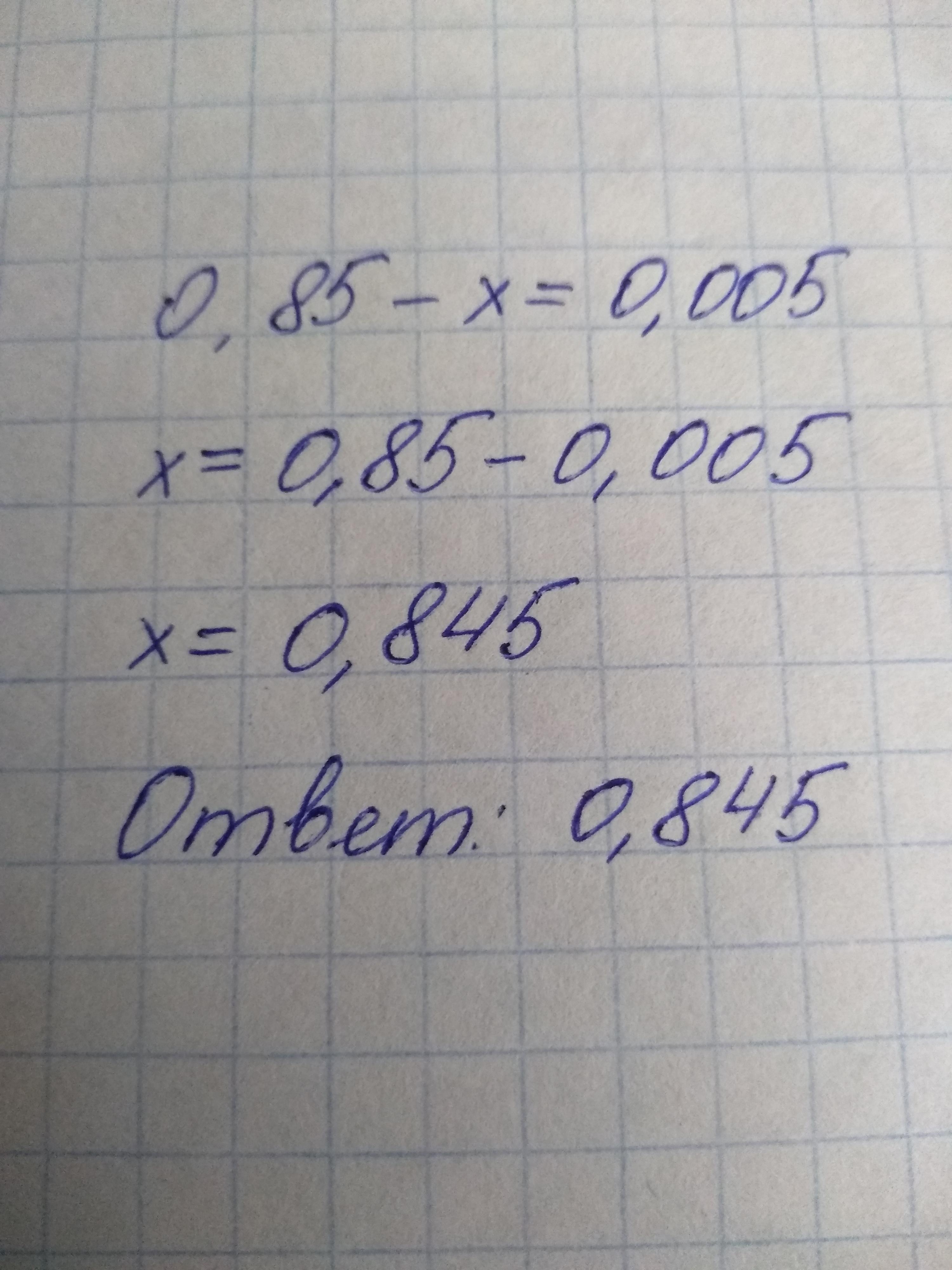 0,85 - x = 0,005 (x - вычитаемое, 0,85 - уменьшаемое, 0,005 - разность. Нам нужно найти x, т. е. вычитаемое. Чтобы найти вычитаемое, нужно из уменьшаемого вычесть разность) Получим: