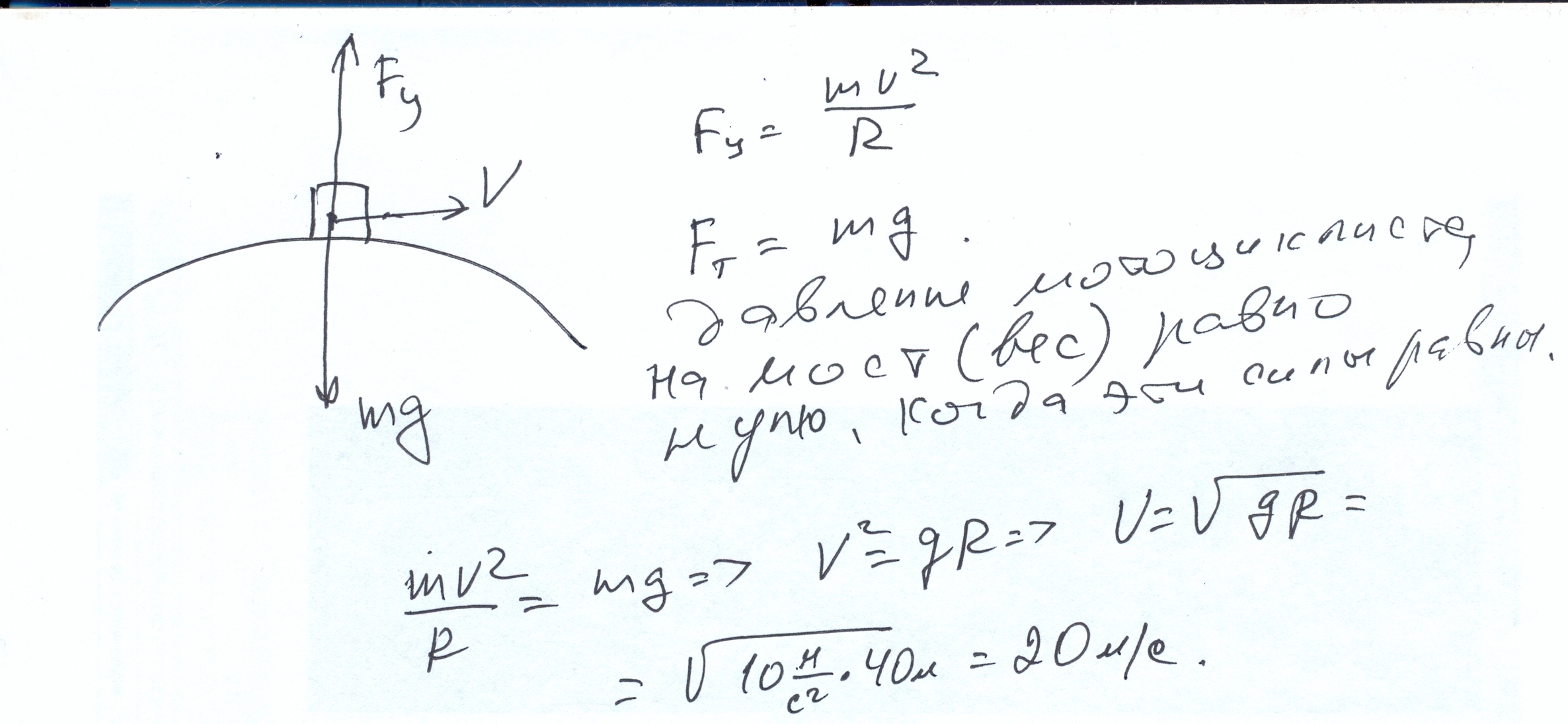 С какой скоростью должен двигаться мотоцикл по выпуклому участку дороги,имеющему радиус кривизны 40м,чтобы в верхней точке этого участка давление на дорогу было равно нулю?