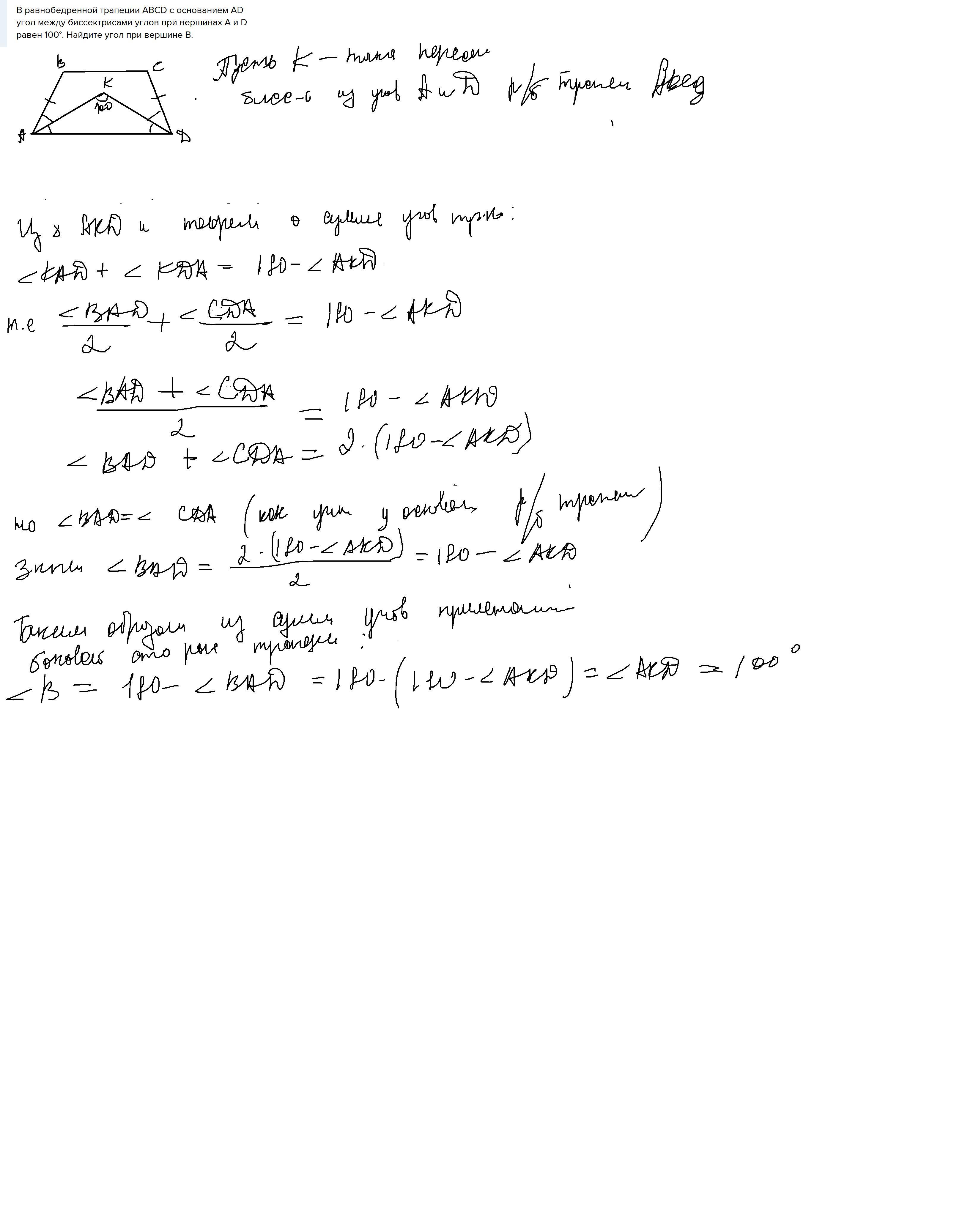 В равнобедренной трапеции ABCD с основанием AD угол между биссектрисами углов при вершинах А и D равен 100°. Найдите угол при вершине В.