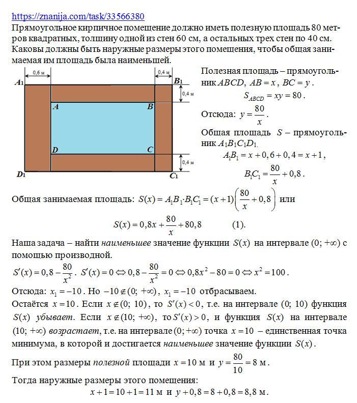 Прямоугольное кирпичное помещение должно иметь полезную площадь 80 метров квадратных, толщину одной из стен 60 см, а остальных трех стен по 40 см. Каковы должны быть наружные размеры этого помещения, чтобы общая занимаемая им площадь была наименьшей.
