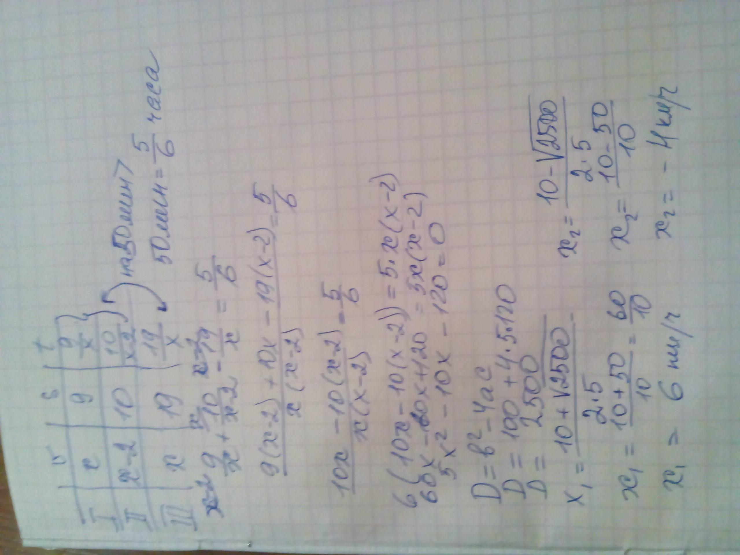 турист прошел с определенной скоростью 9 км, затем, уменьшив скорость на 2 км/ч, прошел еще 10 км. если бы все пройденное им расстояние он шел с той же скоростью, с какой шел первые 9 км, то он был бы в пути на 50 мин меньше. определите первоначальную скорость туриста (в км/ч). ДОЛЖНО ПОЛУЧИТЬСЯ 6 КМ /Ч