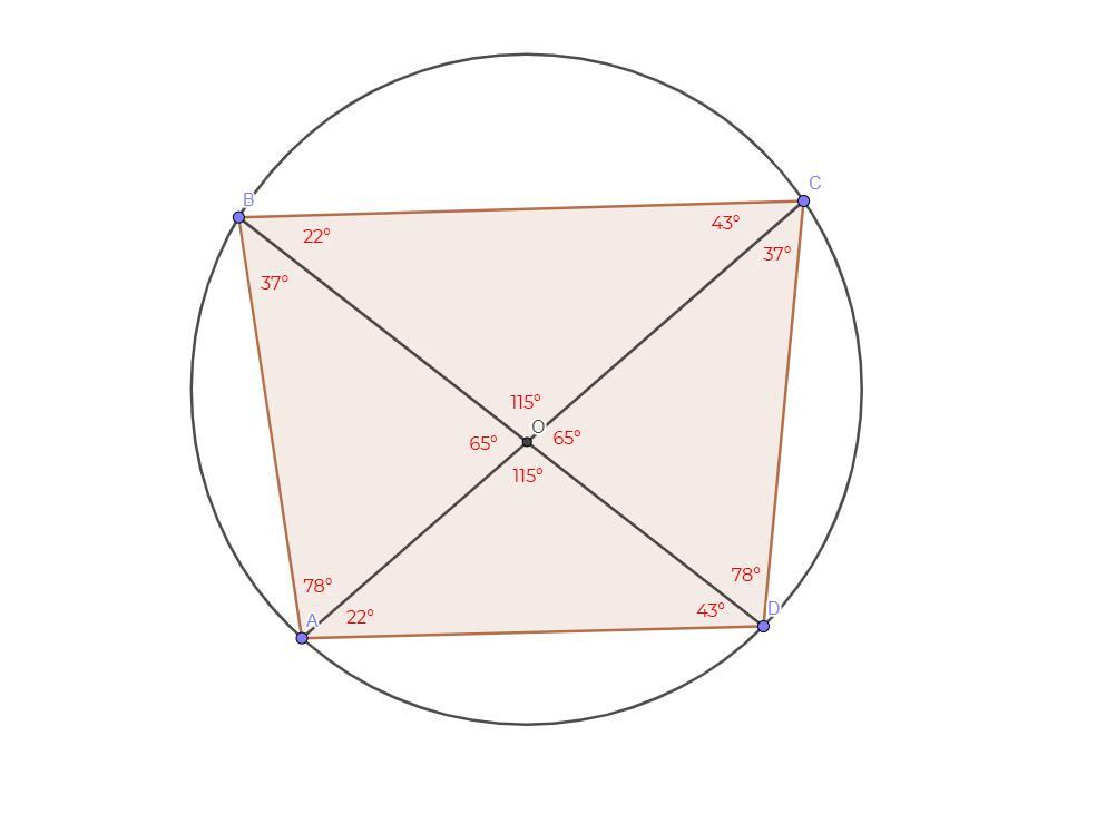 Перевірка (у вписаного чотирикутника в коло сума протилежних кутів рівна):
