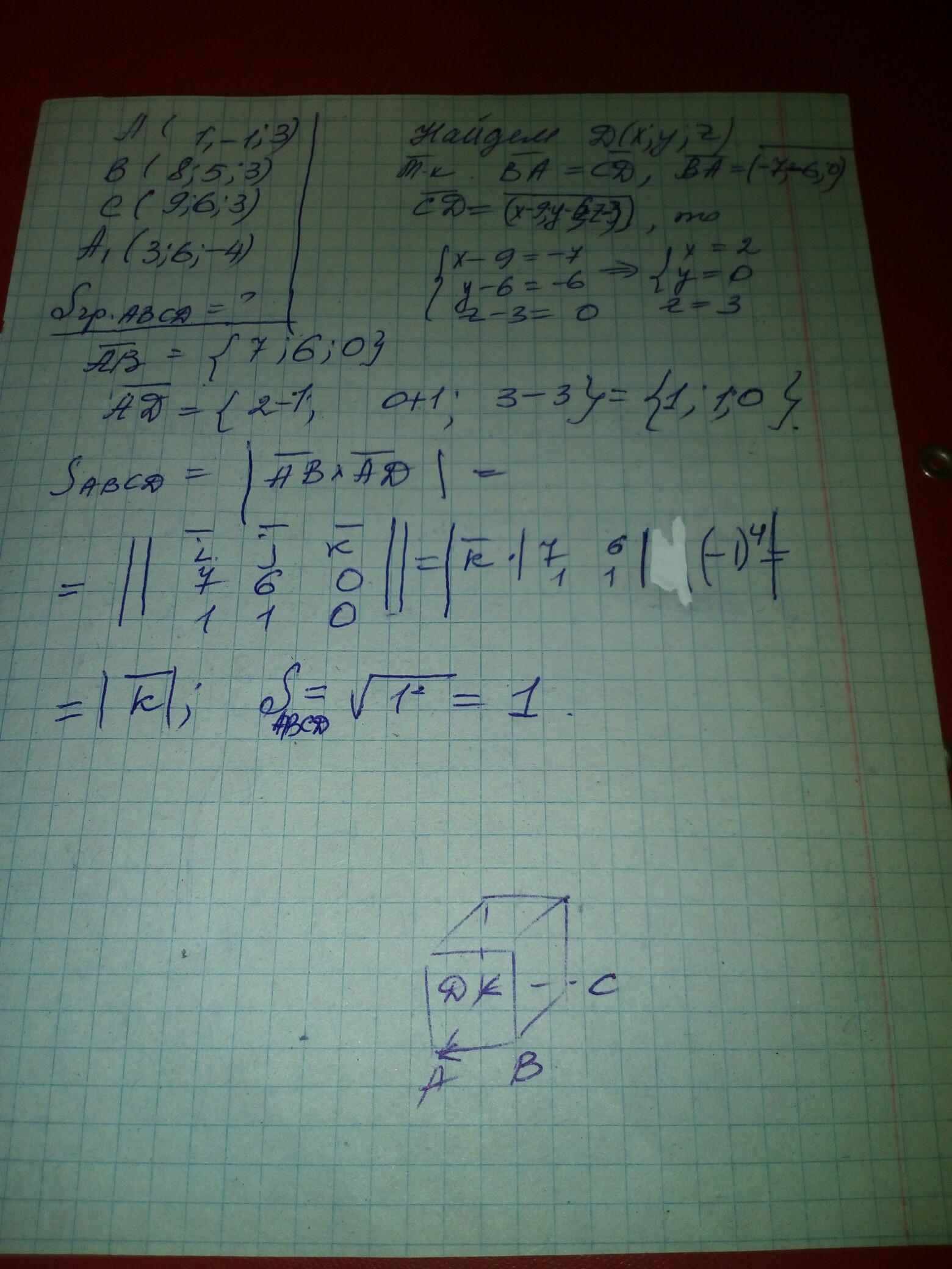 Так как площадь треугольника АВС равна половине модуля, то есть (1/2), то площадь АВСД равна 1.