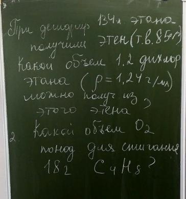 Задача 1. При дегидрировании 134 л этана получили этен (практический выход 85%). Какой объем 1,2-дихлорэтана (ρ=1,24 г/мл) можно получить из этого этена?