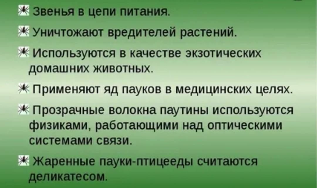 Многие паукообразные питаются вредными для человека насекомыми, сокращая их численность.