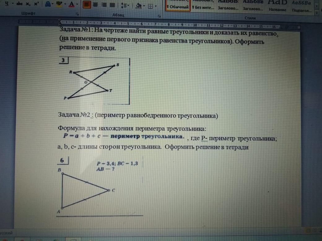 №1 RO=OT(по условию),SO=OP(по условию), угол ROS=углу POT(вертикальные). Отсюда следует, что треугольники ROS и POTравны по 1 признаку равенства треугольников(по двум сторонам и углу между ними), что и требовалось доказать
