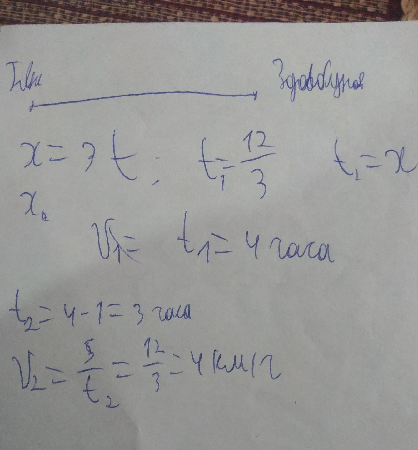 З Рівного до Здолбунова вийшов пішохід і рухався з швидкістю 3км/год.Через одну год за ним вийшов другий пішохід і прийшов у Здолбунів одночасно з першим.Яка швидкість руху другого пішохідна, якщо відстань між містами 12 км?
